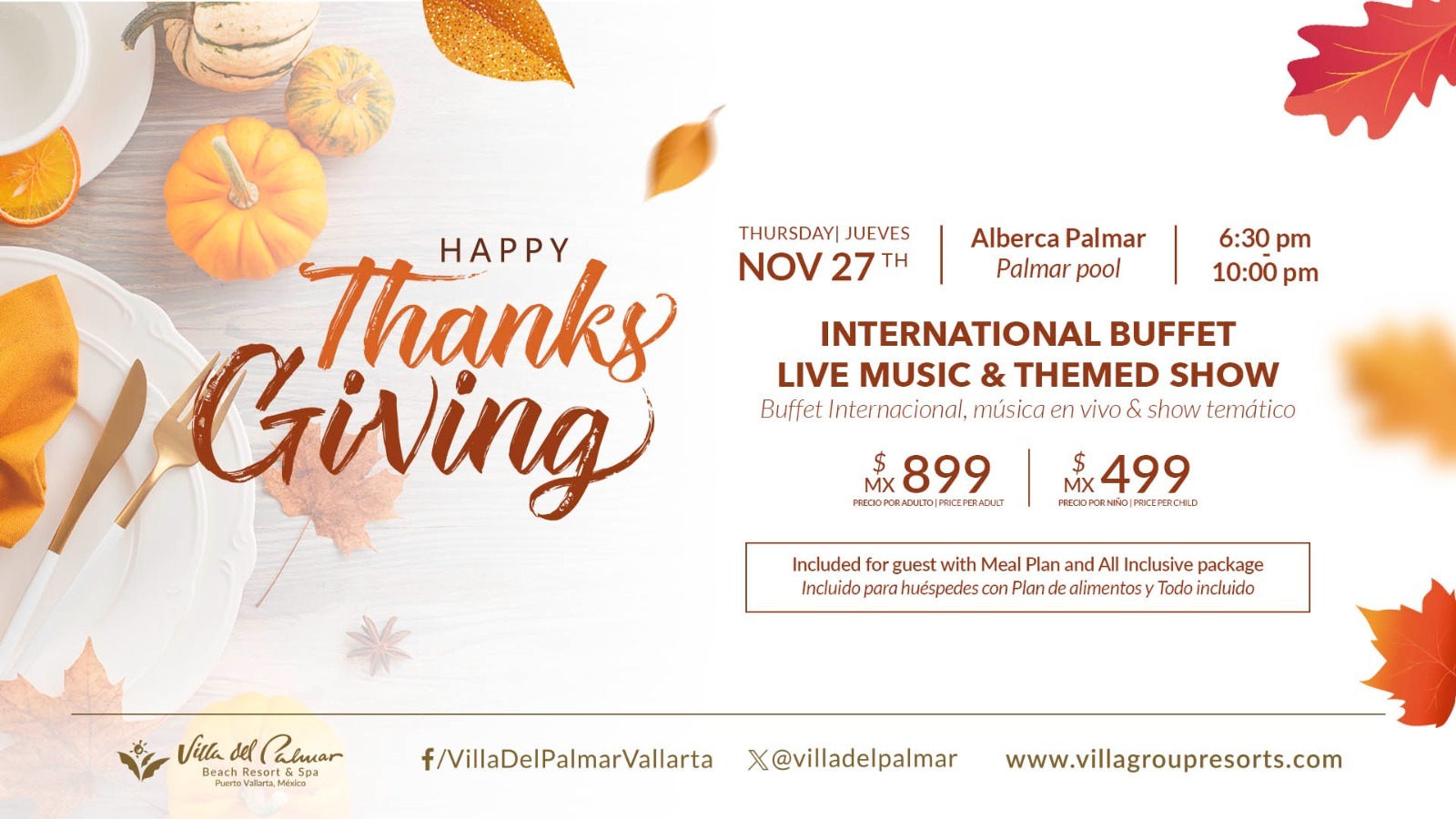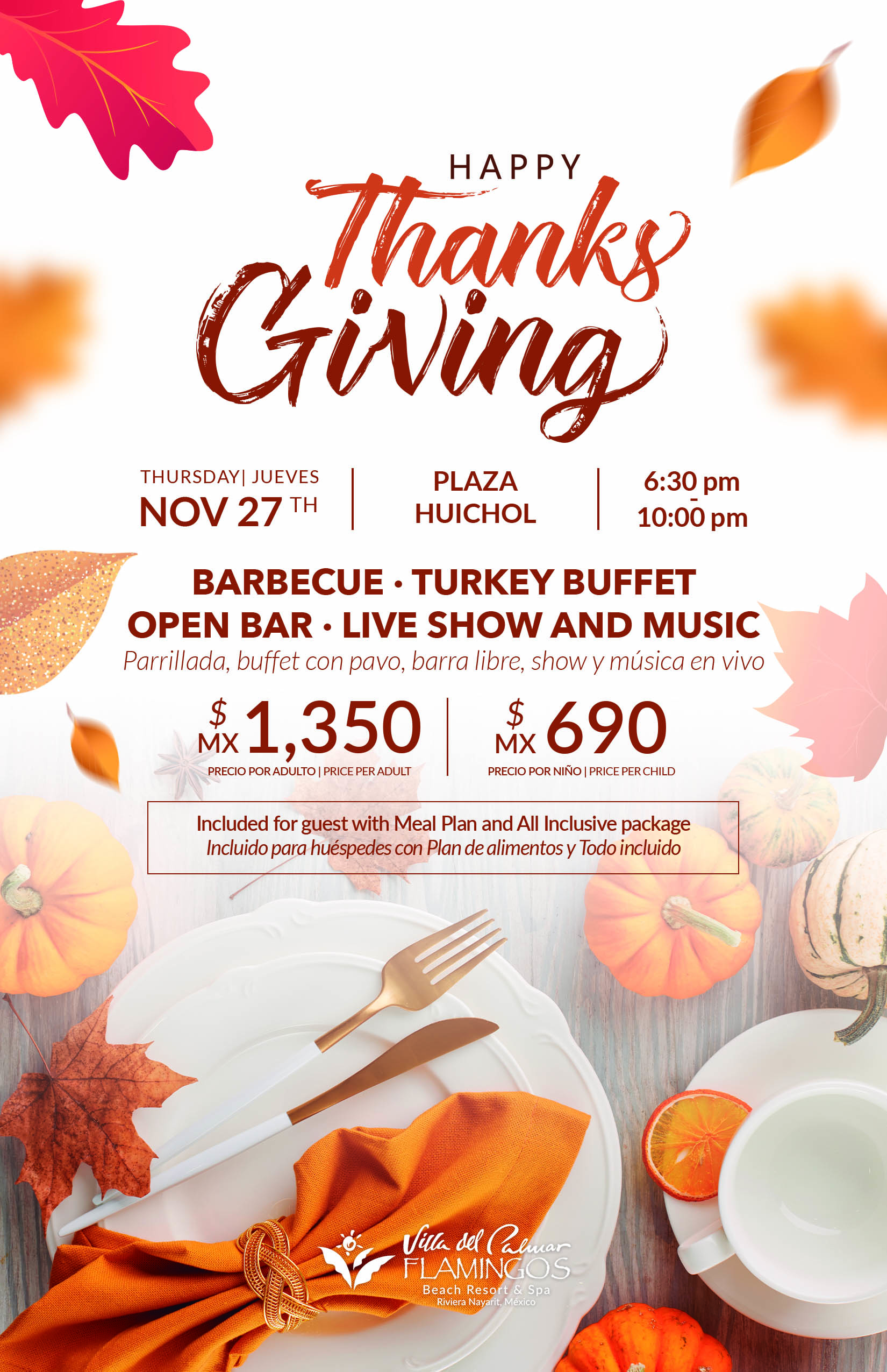 Barbecue, turkey buffer, open bar, live show and music.