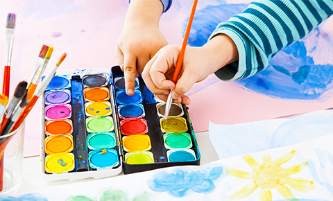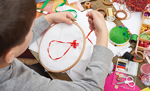 Create arts and crafts using a variety of brightly colored yarn.